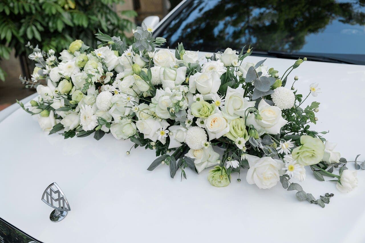 Flowers, ribbons, and elegant decor matched to your wedding theme. Your car will look as special as the day.